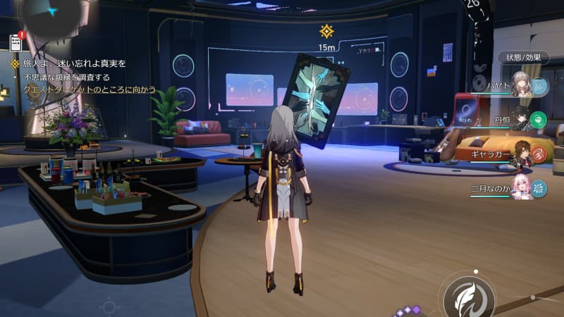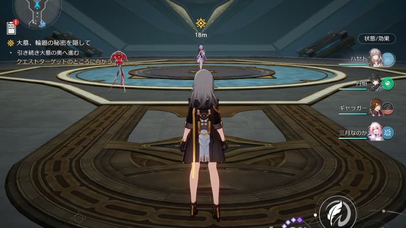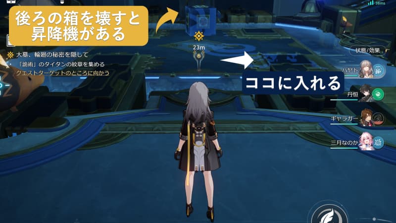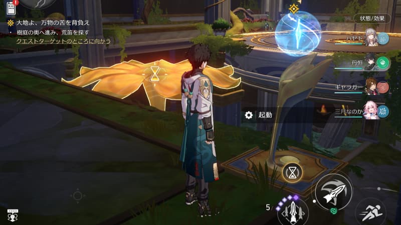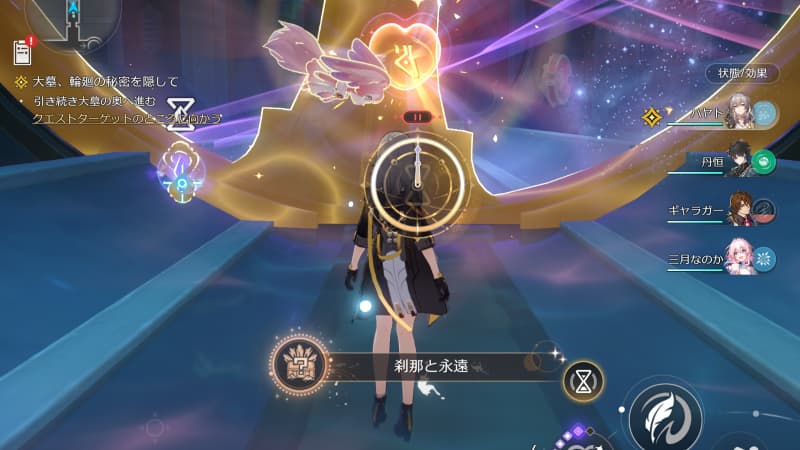 右の「神座」を起動してから、花に乗って時間を戻して下の階へ移動し、クエストターゲットへ。